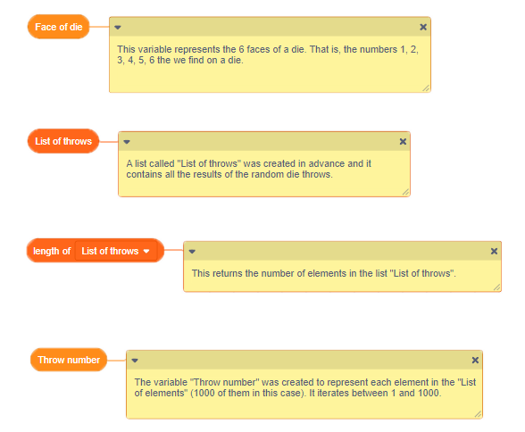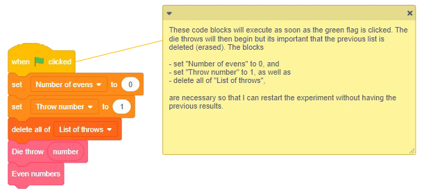 - A block of code to simulate a roll of a six-sided die and compile the results.