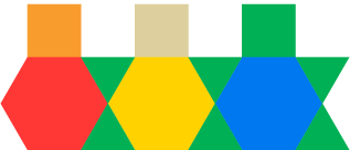 For example, in the image below, the student has created a pattern where the beginning is a yellow hexagon with an orange square on top of it and the end is two green triangles, each with one vertex touching a vertex of the other triangle.