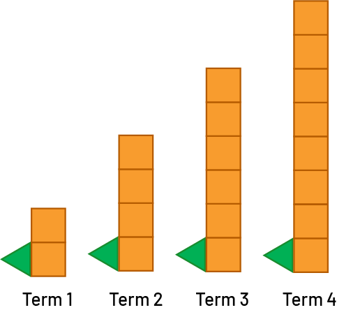 In the 1st position, there is 1 green triangle and 1 group of 2 orange squares. In the 2nd position, there is 1 green triangle and 2 groups of 2 orange squares. In the 3rd position, there is 1 green triangle and 3 groups of 2 orange squares. In the 4th position, there is 1 green triangle and 4 groups of 2 orange squares. |