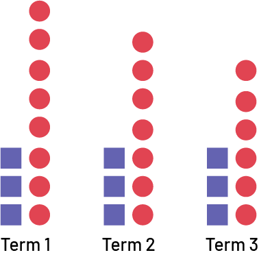 - Term 2 is composed of 3 blue squares and 7 red circles.