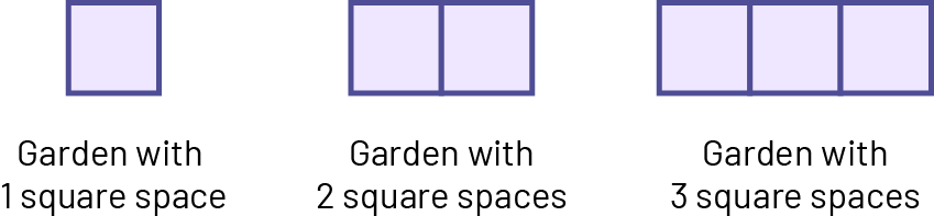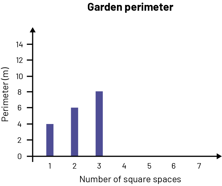 Using a table of values, represent the relationship between the the number of square spaces a garden occupies and its perimeter.