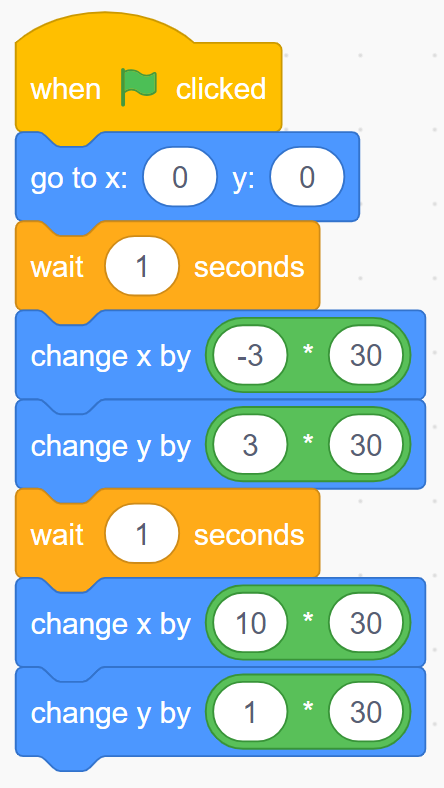 For the second translation, the new starting point (-3, 3) must be considered. So the translation in x is 10 and the translation in y is 1. This last movement is compared to the integers located on a number line; for example, to go from –3 to +7, a movement of 10 units to the right is necessary (horizontal number line). The same principle applies for a movement in y, which is upwards (vertical number line). Encourage the students to use a number line in order to better define the desired movement. Note that the operation blocks that multiply each number by 30 are essential in order to respect the scale of the Cartesian plane which, in this example, includes graduations of 30 pixels. |