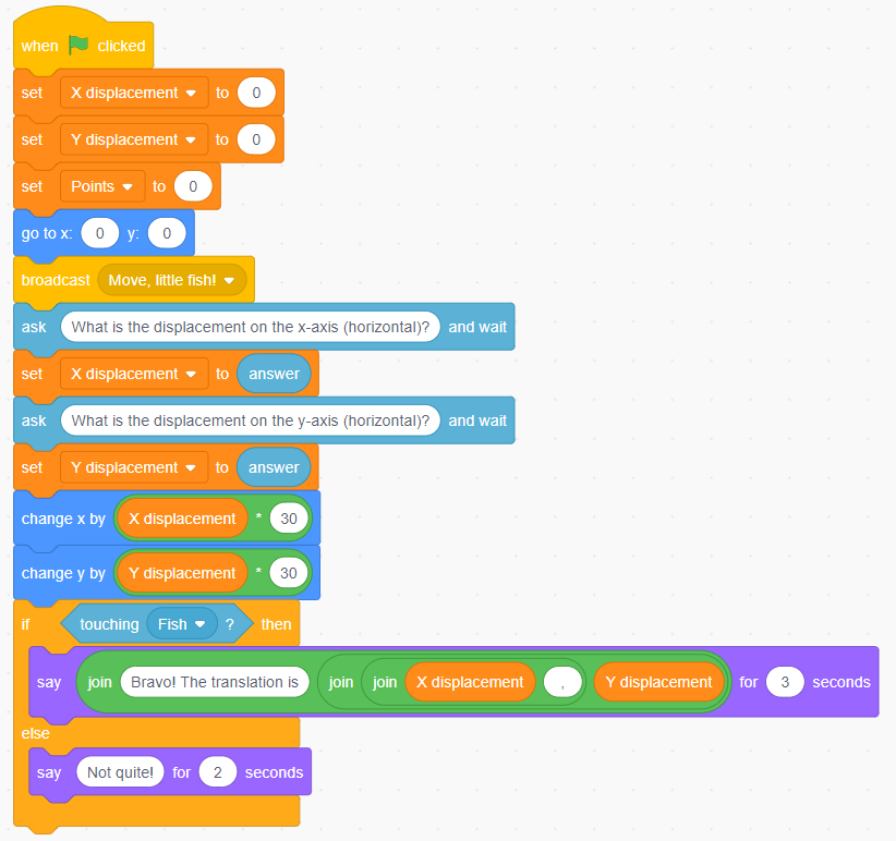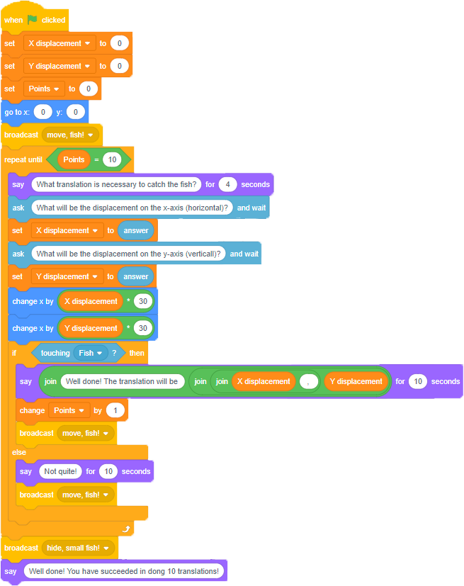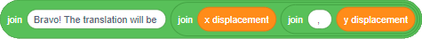Say, "Well done! The translation will be (variable move in x), (variable move in y)." First you have to create a "join" block with four elements (ovals). Example: