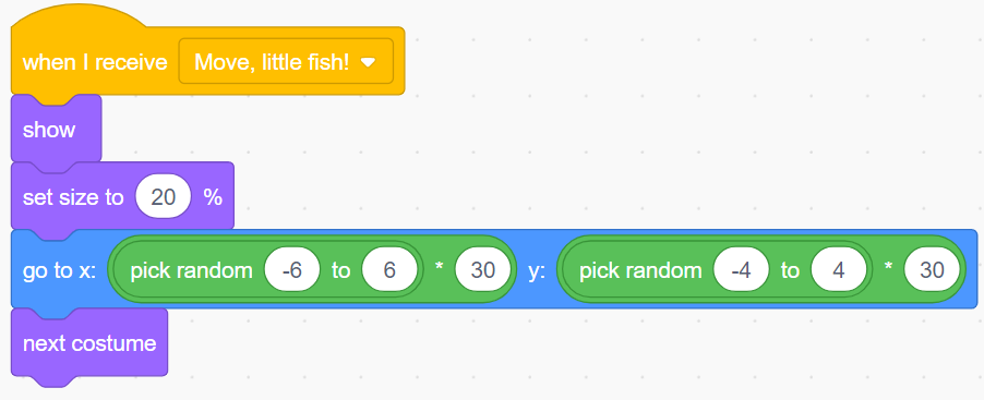 Note: In this code, we see the use of variables that will determine the movements necessary for the hook to "catch" the fish. We also see the use of a "message". Messages allow sprites to interact more and can be very useful in the context of coding a game. In this case, when the message "Move, little fish!" is sent, the fish sprite receives the message and executes the code.