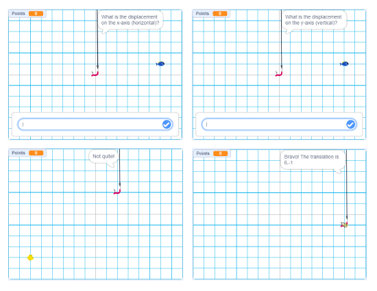 Students code a video game that involves giving directions to a sprite to perform translations on a Cartesian plane in order to "catch another sprite".