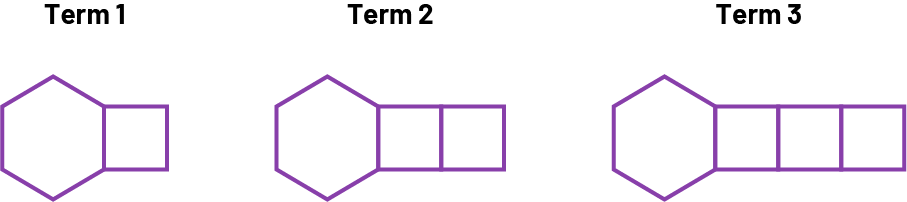 In the 1st term, there are 6 toothpicks to create the hexagon and 1 group of 3 toothpicks to create 1 square. In the 2nd term, there are 6 toothpicks to create the hexagon and 2 groups of 3 toothpicks to create the 2 squares. In the 3rd term, there are 6 toothpicks to create the hexagon and 3 groups of 3 toothpicks to create the 3 squares. From one term to the next term, 3 toothpicks are always added to create 1 more square. Since the growth from one term to the next is constant (+3), this pattern is a linear growing pattern.