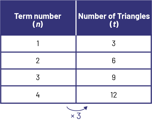 The number of triangles (t) is equal to three times the term number (n): t = 3n.
