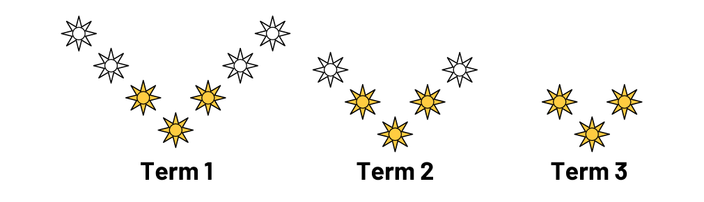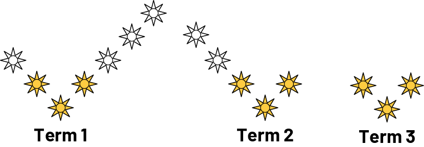 - The elements that make up each term in the pattern are structured to show a regularity. For example, from one term to the next in the above pattern, a sun is added at the end of each branch.