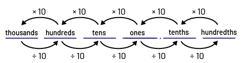 It is important that students also grasp the multiplicative relationship by 10 that exists between adjacent position values. Students have previously developed an understanding of this relationship in the study of natural numbers, that each position has a value 10 times greater than the one to its right and 10 times smaller than the one to its left.