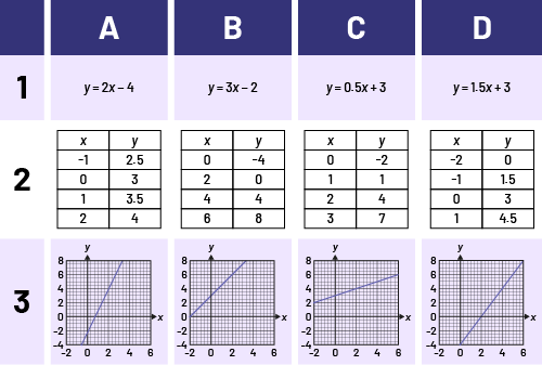 Second match: B1 has a constant rate of 3 in the equation, which implies that the line (A3) will be more steep than the graph with the constant rate of 2. This also implies, that for each increase of one for the x value, the y value will increase by 3 in the table of values (C2).