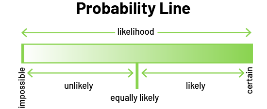 image Probability line in green. On the left, the word impossible, on the right, the word certain, above, in the center, the word probable, below, in the center, the phrase equally likely, in the center left, the word unlikely, and in the center right, the word likely.