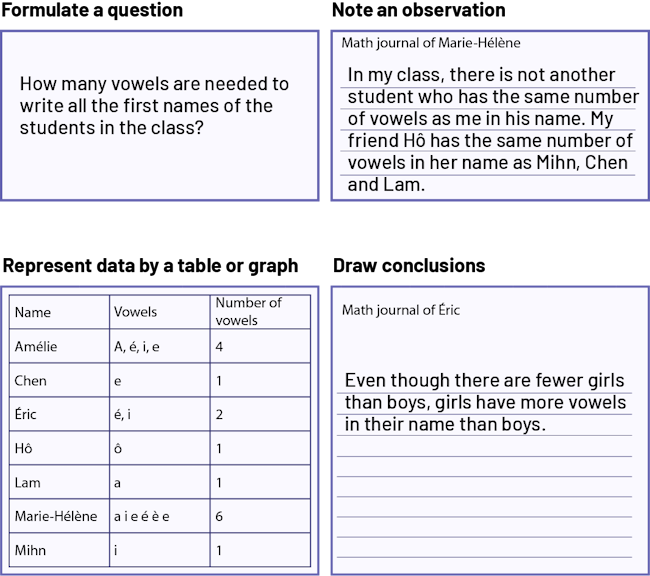 image Four written student papers.The directive for the first one is, "Formulate a question".The student wrote, "How many vowels are needed to write all the first names of the students in the class?"The directive for the second written paper is, "Note an observation". The student wrote, "Math journal of Marie-Hélène. In my class, there is not another student who has the same number of vowels as me in his name. My friend Hô has the same number of vowels in her name as Mihn, Chen and Lam."The directive for the third written paper is, "Represent data by a table or graph". There are students names listed. At each one of them, the student named the vowels and counted them.The directive for the fourth written paper is, "Draw conclusions". The student wrote, "Math journal of Éric Even though there are fewer girls than boys, girls have more vowels in their name than boys."