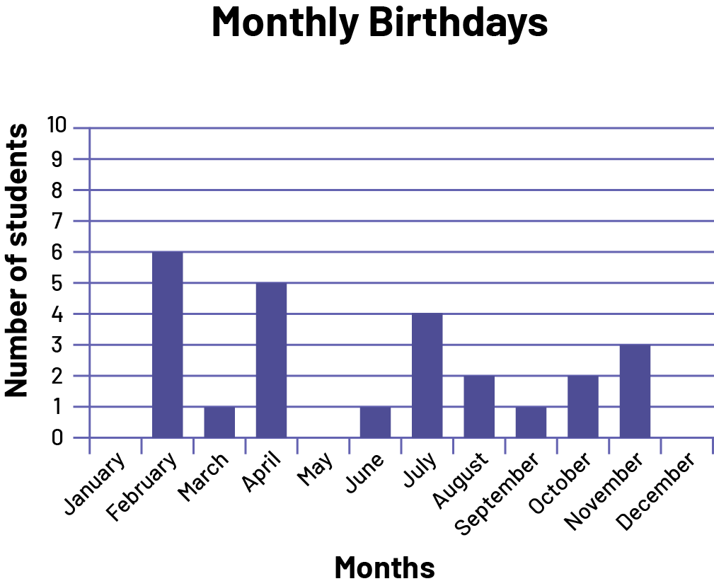 image The bar graph is titled "Monthly birthdays". The vertical axis corresponds to the months while the vertical axis, graduated from zero to ten, corresponds to the number of students. There is no bar in January. In February, the bar rises to six. In March, the bar rises to one. In April, the bar rises to five. In May, there are no bar. In June, the bar rises to one. In July, the bar rises to four. In August, the bar rises to two. In September, the bar rises to one. In October, the bar rises to two. In November, the bar rises to three. And in December, there is no bar.