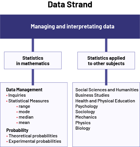 image Title: Data strand Major Component: Managing and interpretating quantitative data Two related sub-elements: 'Statistics in mathematics' and 'Statistics applied to other subjects'Under 'Statistics in Mathematics', Data Literacy;Inquiries,Data measurement,Range, Mode, Median,Mean Probability : Theoretical probabilities, Experimental probabilitiesUnder “Statistics applied to other subjects”; Social Sciences and Humanities, Business Studies, Health and Physical Education, Psychology, Sociology, Mechanics, Physics, Biology