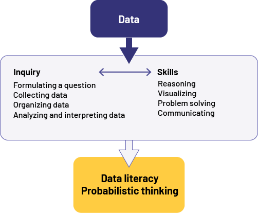 image First box: Data Arrow pointing to another box with two headings connected by a straight line with an arrow at each end: Inquiry and Skills Under "Inquiry",Formulating a question Collecting data Analyze the data and interpret the results Under "Skills",Reasoning Visualizing Problem Solving Communicating Arrow from this box to another box with the following titles: Data Literacy Probabilistic Thinking