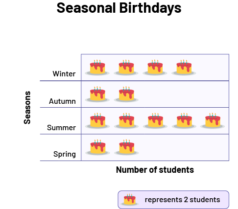 image Horizontal pictogram chart with the title Seasonal birthdays, the title of the vertical axis, Seasons, and the title of the horizontal axis, Number of Students. It is composed of four categories: Winter, with four cakes, Automn, with two cakes, Summer, with five cakes, and Spring, with two cakes. Legend: one cake represents two students.