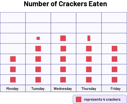 Each day for a week, the teacher records the number of crackers in the students' lunch bags. The following week, the teacher presents the results to the students using the pictograph below. The key indicates that there is a four-to-one correspondence.