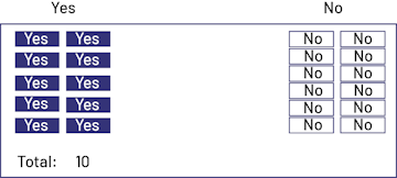 Image Two diagrams: Yes and No. The Yes chart has 11 ”Yes“ written on purple rectangles and presented in two columns. The No chart has 3 ”No's“ written on white rectangles and presented in one column.