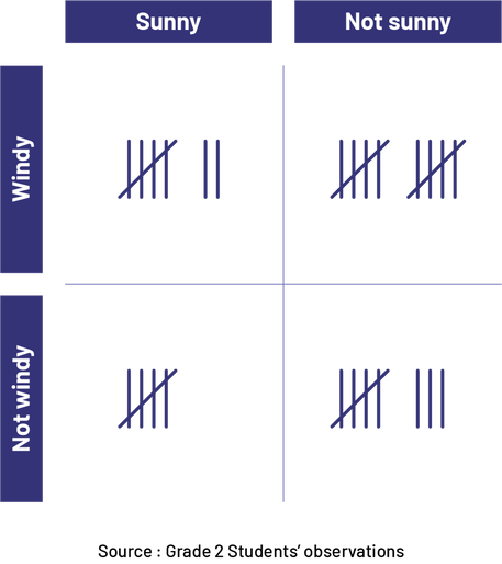 Image The source of the table comes from the observations of the students in grade two. The table contains two columns and two rows. In the box corresponding to both the column named 'Sunny' and the row named 'Windy', there are seven sticks. In the box corresponding to the column named 'Not Sunny' and the row named 'Windy', there are ten sticks. In the box corresponding to the column named 'Sunny' and the row named 'Not Windy', there are five sticks. And in the box corresponding to the column named 'Not Sunny' and the row named 'Not Windy', there are eight sticks.