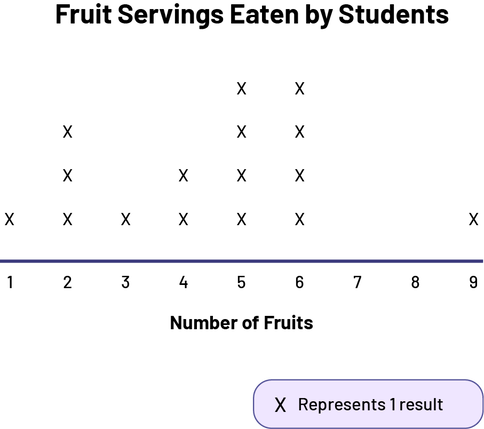 A team conducts a survey to determine the number of servings of fruit that students eat daily. Team members simultaneously collect and record data by placing an 'X' in the appropriate location on a line plot.