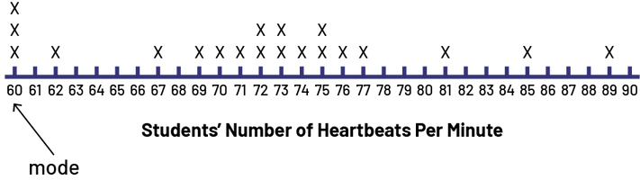 Image Number line, titled Students’ Number of Heartbeats Per Minute, numbered from 60 to 90, 60 being the mode. 60 beats: three Xs 62 beats: one X 67 beats: one X 69 beats: one X 70 beats: one X 71 beats: one X 72 beats: two Xs 73 beats: two Xs 74 beats: one X 75 beats: two Xs 76 beats: one X 77 beats: one X 81 beats: one X 85 beats: one X 89 beats: one X