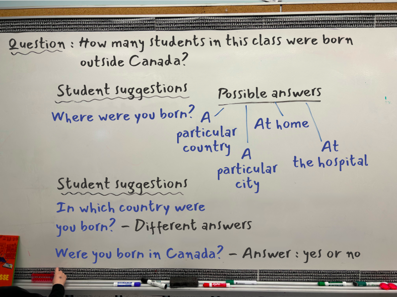 In a discussion, a student asks how many students in the class were born outside of Canada. The teacher takes the opportunity to point out that this is a good question of interest. The teacher then suggests that the students conduct a survey and asks them how the survey question could be worded.