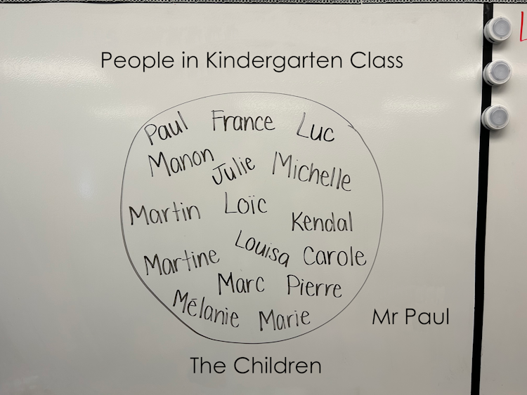 Image On a whiteboard, a set of first names is circled in felt-tip pen. Above the set, it is written, "Peeople in the Kindergarten Class." Below the set, it is written, "The Children." To the right of the set, it says: "Mr. Paul".