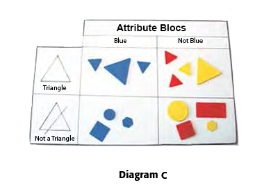 Image Diagram C shows 4 quadrants. The top left quadrant, "Blue" and "Triangle" contains 3 blue triangles of different sizes. The top right quadrant, "Non-blue" and "Triangle", contains 2 yellow triangles and 2 red triangles. The bottom left quadrant, "Blue" and "Non-triangle" contains a blue square, circle and hexagon. And the bottom right quadrant, "Non-blue" and "Not a triangle" contains a yellow circle and hexagon, and a red square and rectangle.