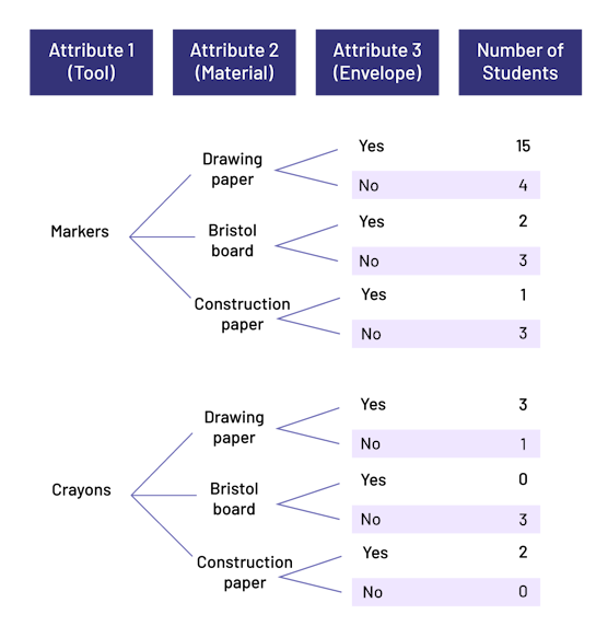 Image Attribute one, the tool, has two options: markers or crayons. Attribute two, the material, has three options: drawing paper, bristol board or construction paper. Attribute three, the envelope, has two options: yes or no. And the number of students varies from zero to 15. When the marker tool is linked to drawing paper and yes, the number of students is 15. When the marker tool is linked to drawing paper and no, the number of students is 4. When the marker tool is linked to bristol board and yes, the number of students is two. When the marker tool is linked to bristol board and no, the number of students is 3. When the marker tool is linked to construction paper and yes, the number of students is one. When the marker tool is linked to construction paper and no, the number of students is three. When the crayons tool is linked to drawing paper and yes, the number of students is 3. When the crayons tool is linked to drawing paper and no, the number of students is one. When the crayons tool is linked to bristol board and yes, the number of students is zero. When the crayons tool is linked to bristol board and no, the number of students is three. When the crayons tool is linked to construction paper and yes, the number of students is 2. And when the crayons tool is linked to construction paper and no, the number of students is zero.