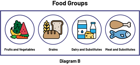 Image Diagram B is an illustration titled "Food Groups" that presents 4 images associated with their respective group. The Fruit and vegetables group is represented by a slice of watermelon, a leaf of lettuce, a banana and a carrot. The Grain group is represented by two loaves of bread and a wheat stalk. The Dairy and substitutes group is represented by a pint of milk, a yogurt drink and a cheese. The Meat and substitutes group is represented by a fish and a chicken drumstick.
