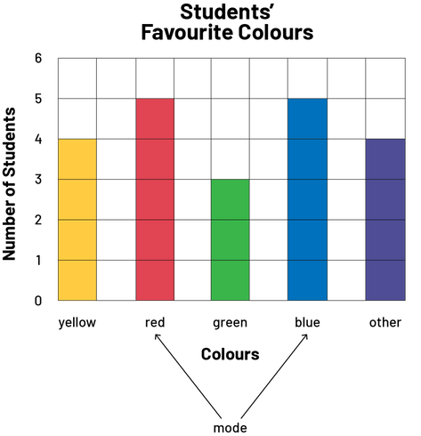 Image The colored 5-bar graph is titled: "Students’ Favorite Colours". The horizontal axis is called "Colours", while the vertical axis is called "Number of Students". The yellow bar goes up to the number 4. The red bar goes up to number 5. The green bar goes up to the number 3. The blue bar rises to the number 5, and the purple bar meaning "Other" rises to the number 4. With arrows, the word "mode" points to the red bar and the blue bar.