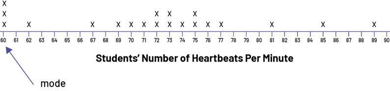 Image The counting line is titled "Students’ Number of Heartbeats Per Minute". It is graduated from 60 to 90. With an arrow, the word "mode" points to the number 60. The numbers that have no X's are: 61, 63, 64, 65, 66, 68, 78, 79, 80, 82, 83, 84, 86, 87, 88, and 90. The numbers 62, 67, 69, 70, 71, 74, 76, 77, 81, 85 and 89 have an X. The numbers 72, 73 and 64 have two X's. The number 60 has three X's.