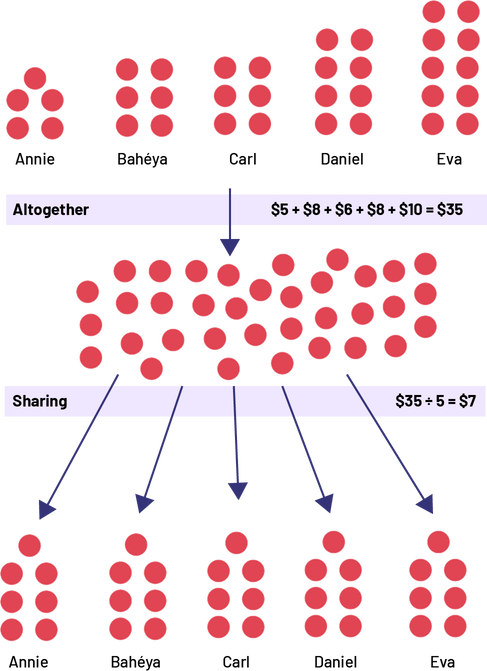 First, the money is pooled to find that there is $35 in total, which is equal to $5 + $6 + $6 + $8 + $10 = $35. The money is then divided equally and each person receives $7, which is equal to $35 ÷ 5 = $7.