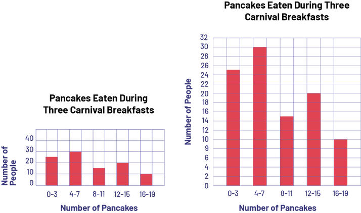 A red five-bar graph is titled "Pancakes Eaten During Three Carnival Breakfasts". The horizontal axis is called "Number of Pancakes" while the vertical axis is called "Number of People". Bar 0 to 3 goes up to number 25, bar 4 to 7 goes up to 30, bar 8 to 10 goes up to 15, bar 12 to 15 goes up to 20 and bar 16 to 19 goes up to 10.