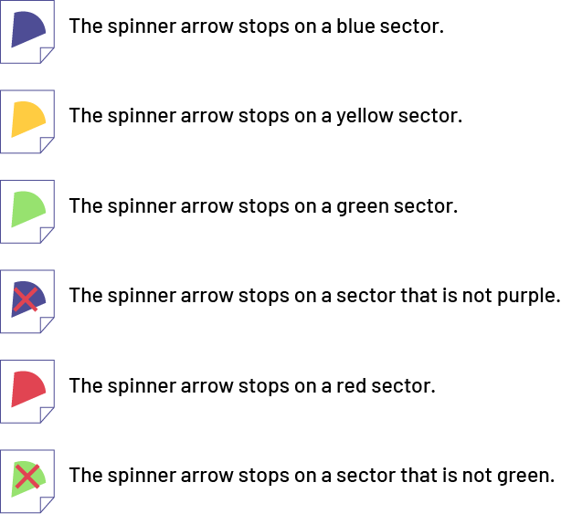 Other students have difficulty distinguishing between the characteristics never and impossible. It is difficult for them to understand that while an impossible event is one that can never happen, an event that has never happened is not necessarily impossible. For example, it is impossible for the arrow in the previous example to land in a yellow sector, so even if you spin it 100 times, it will never land in a yellow sector. On the other hand, even if after 100 tries, the arrow has never landed in a green sector, this does not necessarily mean that this outcome is impossible.