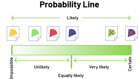 Image The illustration is titled: Probability Line. Below it, the word "likely" has a left-pointing arrow on its left, and a right-pointing arrow on its right. Below it, a progressive white bar gradually turns green. At the far left of the bar is the word "impossible", above which appears the yellow pie slice. Below the first half of the bar, it says "somewhat likely", with the green and red pie slices associated with it. In the middle of the bar is the word "equiprobable", with the blue pie slice associated with it. Below the second half of the bar, it says "very likely", with the green pie slice marked with a red X associated with it. And above the word "certain" on the far right of the bar is the purple pie slice with a red X.