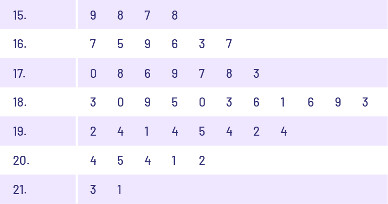 image The numbers associated with the number 15 are: 9, 8, 7, 8. The numbers associated with the number 16 are: 7, 5 9, 6, 3, 7. The numbers associated with the number 17 are: zero, 8, 6, 9, 7, 8, 3. The numbers associated with the number 18 are: 3, zero, 9, 5, zero, 3, 6, one, 6, 9, 3. The numbers associated with the number 20 are: four, five, four, one, two. The numbers associated with the number 21 are: three, one.