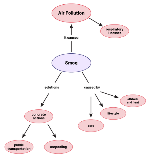 image The concept map contains expressions written in bubbles linked together by arrows. It begins with the bubble containing the expression 'Smog'. Encountering the out-of-bubble phrase 'It causes', 'Smog' is linked to 'Air pollution'. 'Air pollution' is linked to 'respiratory illnesses'. Encountering the non-bubble expression 'solutions', 'Smog' is also linked to 'concrete actions', which is linked to 'public transportation' and 'carpooling'. Encountering the non-bubble expression 'caused by', 'Smog' is linked to 'cars', 'lifestyle', and 'altitude and heat'.