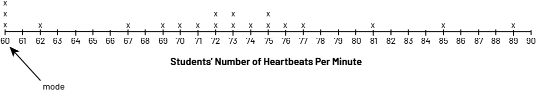 - From the line plot below, the mode corresponds to 60 heartbeats per minute. This number is far from the interval that contains most of the data points (69 to 77). Also, the range of the data (29) is large, and each data value appears only once, twice, or three times, so it would be best to not use the mode to draw a conclusion about this set of data.