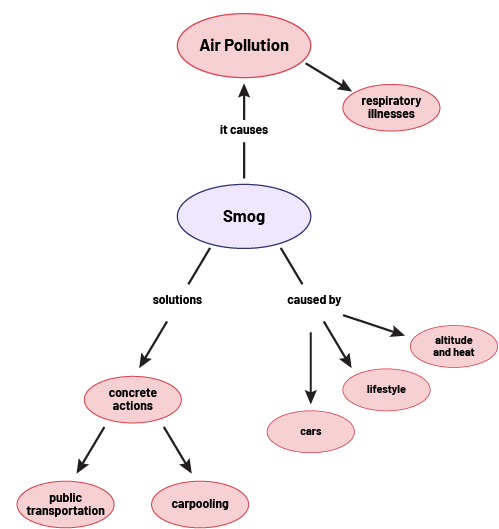 image Concept map in which students' ideas are organized. In the middle of the map, in a bubble, it says "Smog". An arrow points to a bubble at the top. In the arrow it says "it causes", in the top bubble it says "Air pollution". Next to this bubble, there is an arrow pointing to another bubble "respiratory illnesses". Back to the center bubble "Smog". There is an arrow pointing down to the left. In the arrow it says "solutions". It points to a bubble in which it says "concrete actions". There are two arrows that go from this bubble to two other bubbles, "public transportation" and "carpooling". Back to the center bubble "Smog". There is an arrow pointing down to the right. The arrow says "caused by". It points to three bubbles that say "altitude and heat", "lifestyle" and "cars".