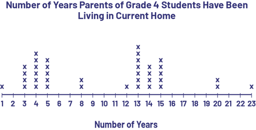image The number line is titled: "Number of years parents of grade 4 have been living in current home.” The line named "Number of Years" is scaled from one to 23. The number one shows the presence of one X. Number two has no X’s. Number 3 has 4 X’s. Number 4 has 6 X’s. Number 5 shows 5 X's. Numbers 6 and 7 show no X’s. Number 8 has two X's. Numbers 9, ten and 11 have no X’s. Number 12 has one X. Number 13 has 7 X's. Number 14 has 4 X's. Number 15 has 5 X's. Numbers 16, 17, 18 and 19 have no X. Number 20 has 2 X's. The numbers 21 and 22 have no X. Number 23 has one X.
