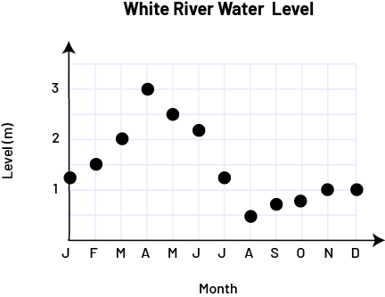 image The broken line diagram with connected dots is titled "White River Water Level". The horizontal axis is named "Month" while the vertical axis, graduated from zero to three, is named "Level in meters". At the letter J, the point is slightly above one. At the letter F, the point is at one and a half. At the letter M, the point is at two. With the letter A, the dot is at three. With the letter M, the dot is two and a half. At the letter J, the point is above two. At the next letter J, the dot is between one and one and a half. At the letter A, the point is at one and a half. At the letter S, the dot is below one. At the letter O, the dot is slightly closer to number one. At the letter N and the letter D, the dot is at one.