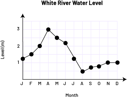 image The broken line diagram is titled "White River Water Level". The horizontal axis is named "Month" while the vertical axis, graduated from zero to three, is named "Level in meters". At the letter J, the point is slightly above one. At the letter F, the point is at one and a half. At the letter M, the point is at two. With the letter A, the dot is at three. With the letter M, the dot is two and a half. At the letter J, the point is above two. At the next letter J, the dot is between one and one and a half. At the letter A, the point is at one and a half. At the letter S, the dot is below one. At the letter O, the dot is slightly closer to one. At the letter N and the letter D, the dot is at one.