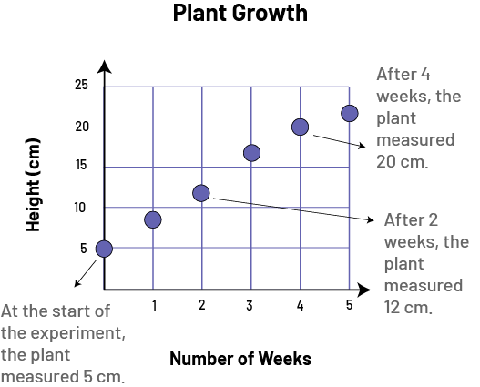 image A broken line diagram is titled “Plant Growth". The horizontal axis, graduated from zero to five, is named "Number of weeks", while the vertical axis, graduated from zero to 25, is named "Height in centimeters". Additional information accompanies every other dot. At zero on the horizontal axis, the dot is at five on the vertical axis, with the following information: “At the start of the experiment, the plant measured five centimeters". At one on the horizontal axis, the dot is slightly below ten. At two on the horizontal axis, the dot is slightly above ten, with the following information: "After two weeks, the plant measured 12 centimeters". At three on the horizontal axis, the dot is slightly above 15. At 4 on the horizontal axis, the dot is at 20, with the following information: "After 4 weeks, the plant measured 20 centimeters". At 5 on the horizontal axis, the dot is between 20 and 25.