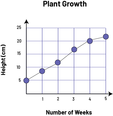 image A broken line diagram with connected dots is titled "Plant Growth". The horizontal axis, graduated from zero to five, is named "Number of weeks", while the vertical axis, graduated from zero to 25, is named "Height in centimeters". At zero on the horizontal axis, the dot is at five on the vertical axis. At one on the horizontal axis, the dot is slightly below ten. At two on the horizontal axis, the dot is slightly above ten. At three on the horizontal axis, the dot is slightly above 15. At 4 on the horizontal axis, the dot is at 20. At 5 on the horizontal axis, the dot is between 20 and 25.