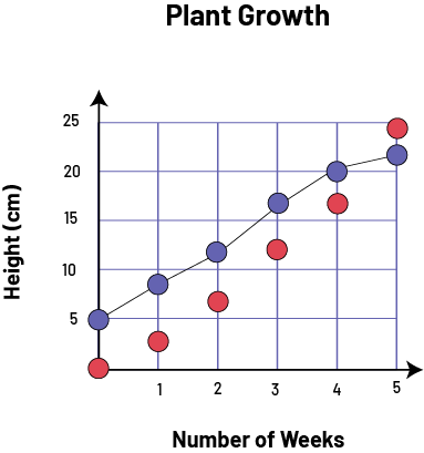 image A double broken line diagram is titled "Plant Growth". The horizontal axis, graduated from zero to five, is named "Number of weeks", while the vertical axis, graduated from zero to 25, is named "Height in centimeters". The first sequence of dots is purple and the dots are connected. The second sequence is red and the dots are not connected. At zero on the horizontal axis, the purple dot is at five on the vertical axis, while the red dot is at zero. At one on the horizontal axis, the purple dot is slightly below ten while the red dot is between zero and one. At two on the horizontal axis, the purple dot is slightly above ten while the red dot is slightly above five. At three on the horizontal axis, the purple dot is slightly above 15 while the red dot is between ten and 15. At 4 on the horizontal axis, the purple dot is at 20 while the red dot is between 15 and twenty. And at five on the horizontal axis, the purple dot is between 20 and 25 while the red dot is at 25.