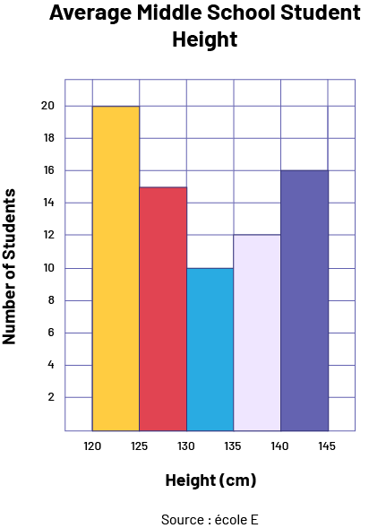 The graph below with five coloured bars is titled "Average Middle School Student Height". The horizontal axis is named "Height (cm)" while the vertical axis, graduated from zero to 20, is named "Number of Students”. The first bar is yellow and rises to 20. The second bar is red and rises to 15. The third bar is blue and goes up to ten. The fourth bar is light purple and rises to between 6 and 15. And the fifth bar is dark purple and rises slightly above 15.