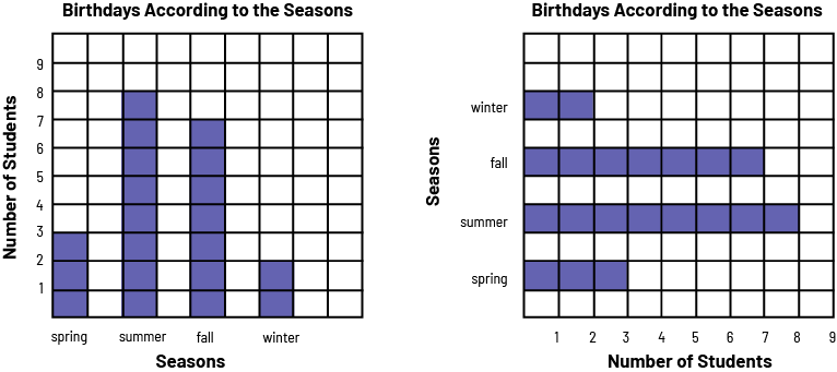 image graph1: A purple 4 bar chart is titled "Birthdays According to the Seasons". The horizontal axis is named "Seasons," and the vertical axis is named "Number of Students". In spring, the bar goes up to 3. In summer, the bar goes up to 8. In the fall, the bar goes up to 7. And in the winter, the bar goes up to two. graph2: A diagram with 4 horizontal purple bars is titled "Birthdays According to the Seasons". The horizontal axis is named "Number of Students", and the vertical axis is named "Seasons". In the spring, the bar indicates three students. In the summer, the bar indicates 8 students. In the fall, the bar indicates 7 students. And in the winter, the bar indicates two students.