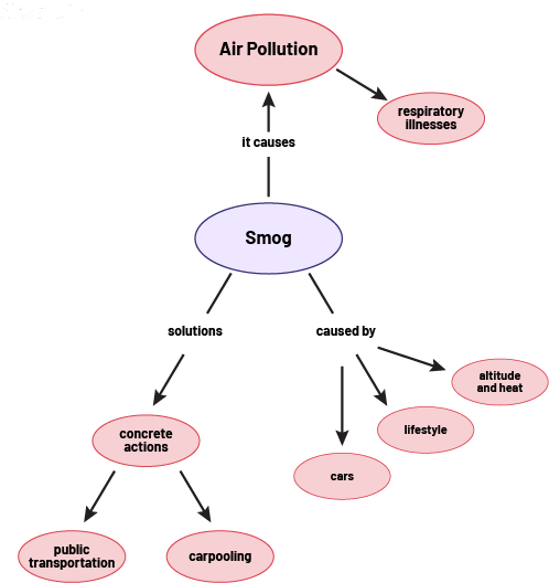 image The concept map contains expressions written in bubbles linked together by arrows. It begins with the bubble containing the expression "Smog". Encountering the out-of-bubble phrase "It causes", "Smog" is linked to "Air pollution". "Air pollution" is linked to "respiratory illnesses". Encountering the non-bubble expression "solutions", "Smog" is also linked to "concrete actions", which is linked to "public transportation" and "carpooling". Encountering the non-bubble expression "caused by", "Smog" is linked to "cars", "lifestyle", and "altitude and heat".