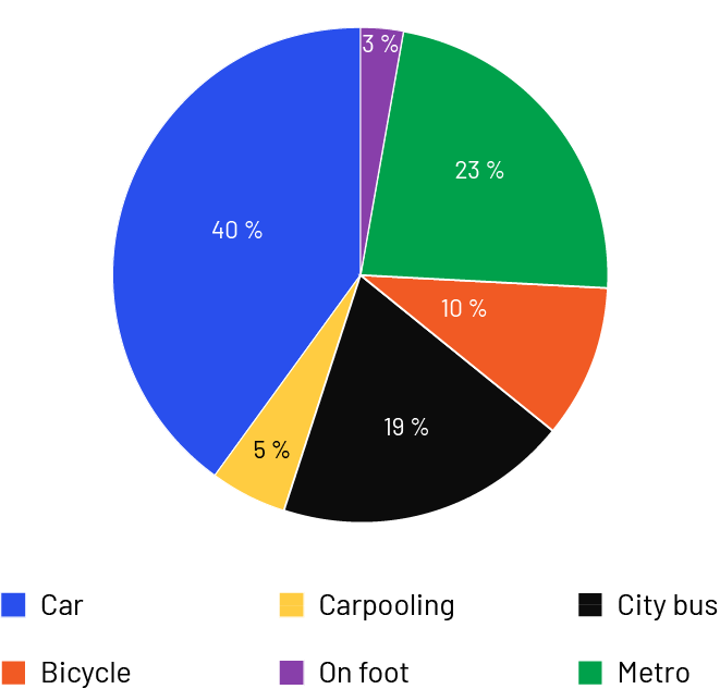 Image The pie chart is entitled: "Means of Transportation Used by 25 to 35 Year Old Citizens in Toronto". It is divided into six parts. The "Car" section occupies 40 percent of the chart. Carpooling occupies 5 percent. City bus occupies 19 percent. Bicycle occupies 10 percent. Walking occupies three percent. And the subway takes up 23 percent.The frequency table gives an overall idea of how the data are distributed, but does not have the advantage of easily comparing the categories with each other, as the circle graph does. The circle graph shows relative frequencies expressed as percentages, so that the data can be analyzed quickly. The frequency table shows, for example, that 35 209 individuals use their own car and 4235 individuals carpool to get around. The same data are much easier to interpret by comparing percentages, saying that 40% of individuals use their own car and 5% carpool. This makes it easier to interpret the distribution of the data.